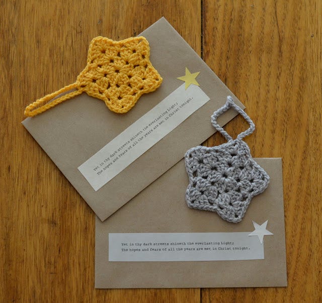 And since I have mentioned carols, I have been giving out crochet stars in abundance. That idea kind of spiralled out of control. After deciding on making one for everyone in my team, our manager then asked the verifiers to our Christmas lunch, so I thought I'd better make them one too (and they deserve stars, because they do very boring things, and don't get insanity money for it), and the operations manager came too, so then I thought I couldn't give him one and leave out the commercial manager ... and you know how these things go ... I have lost count of the crochet stars! But the response has been somewhat overwhelming. I might have even blushed once or twice. I left one on one fellows desk and he then came and found me at my desk and kissed me on the forehead, and told me that was a very nice thought at this time of year, the commercial manager came and found me in the kitchen upstairs and told me it was very special and that in all the years he's worked at the company never has an editor given him a Christmas card, because we are supposed to hate him, and so it went on ... And what surprised me was the comments on the "card".