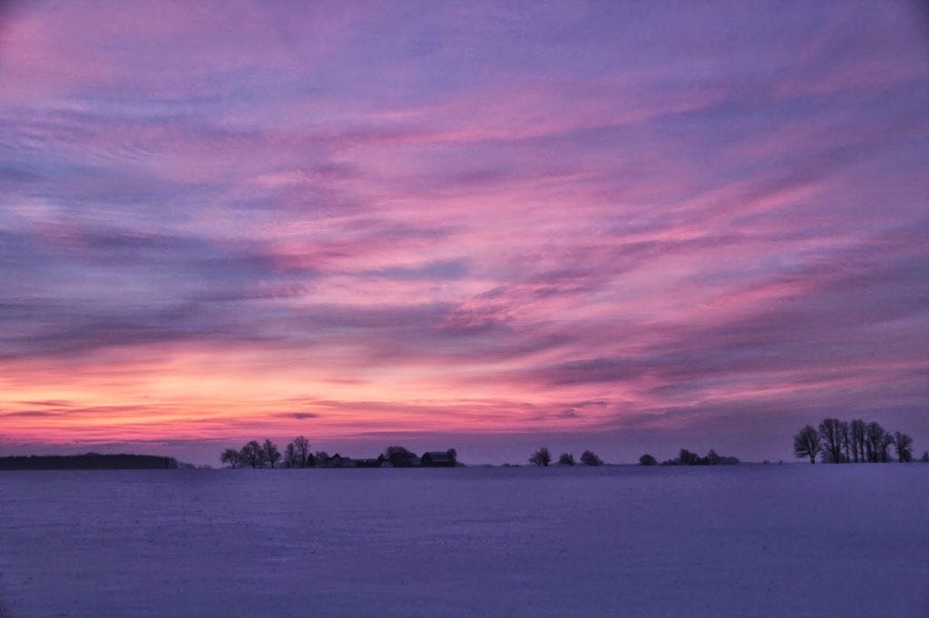 The other morning I was out jogging in my usual purple jacket, with a pinkish/red one underneath that is very light and has holes in it but has very long sleeves I can bury my hands in, and a bright pink ear-band around my head, because that was the dregs of the ALDI ski gear when I decided such a thing could be useful, and a lady came out to the footpath with a wheelie bin and said "you match the sky". It was spectacular sunrise that morning. So here is a morning poem, that has something of Romans 1 about its ending.