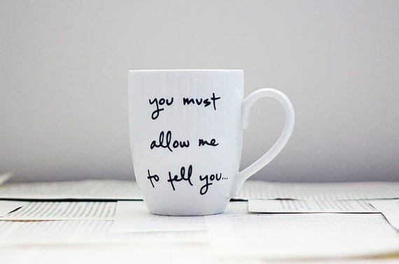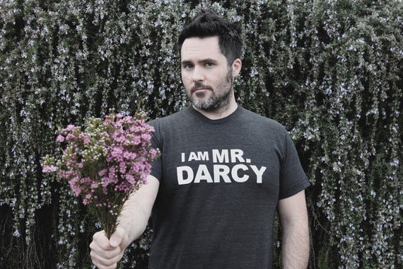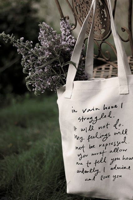 Heh heh. I spotted these t-shirts in this fabulous Jane Austen inspired etsy store, via a blog post of gifts inspired by classic literature, and thought them quite hilarious. And how great are the mugs? You can have Mr Darcy's declaration on a mug, a scarf, a sweater, a notebook, a tote, a tea-towel ... Or you can opt for Captain Wentworth's "You pierce my soul. I am half agony, half hope ...".