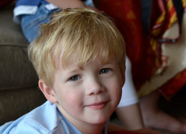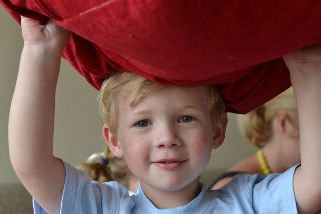 And here is the birthday boy, with one of my foot poofs on his head, because that is what little boys do when they come over - they put your furniture on their heads.