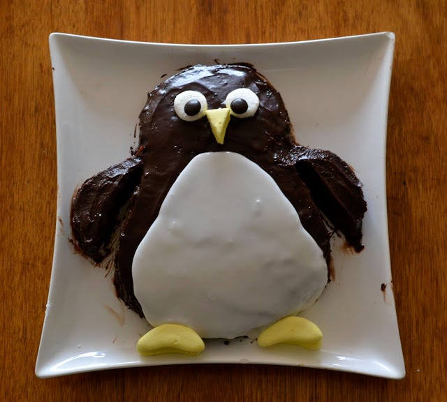 But without further ado, here is the cake. All I did was cut a bit off the sides of basic round mud cake, turn that into wings, then use icing and lollies (bananas, marshmallows and M and Ms) to decorate it. He loves penguins, so penguin it was. (And I loved that the kids got all excited and were calling it a baby penguin. It wasn't particularly meant to be a baby, but obviously it had baby proportions). I'm feeling a bit embarrassed about the smears on the plate in this picture, but it was kind of one step forward two steps backward trying to wipe the excess icing off the plate, and I gave up.