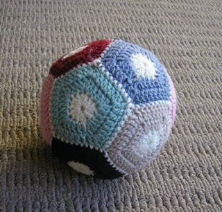 Here is the answer in pictures. I think it's rather sweet, even if I do say so myself. That's navy by the way, not black as it appears in the photo. I would have liked a lighter navy, but since I was looking for 5 ply wool, I bought what I could find, so it's a tad dark. (It's for a baby, if you hadn't guessed and thought I just wanted to make myself a ball.)