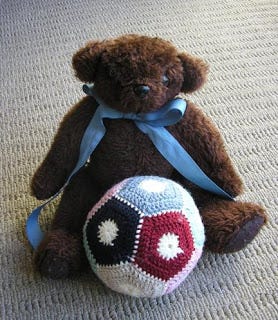 Here is the ball modelled by Abraham the bear. Once upon a time my sister went through a phase of making bears. She didn't like Abraham (though he was nameless then) because his head was too small and his ears were in the wrong place. But I took pity on him and saved him from whatever was to be the fate of a bear with a head too small and ears in the wrong place, and gave him a name and a home. I'm very fond of him now.
