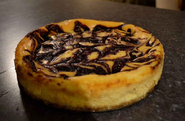 I set the start time for my port and poetry eveningĀ a littleĀ late (at 8pm) and got bored waiting for people to arrive. I'm a baked cheesecake lover, and it was my birthday, so I made baked cheesecake with caramel in the middle and chocolate fudge on top, and blueberry swirl cheesecake (which developed blueberry fault-lines along the swirls), plus a chocolate mudcake (looks comparatively messy and uninteresting). All I can say is, it's just as well I was on supper at church last night to deal with the leftovers!