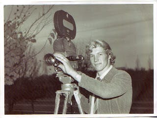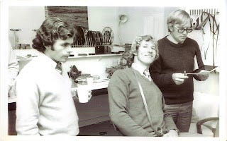 I have some old photos of him at work, and since I now I have a scanner, here they are. I don't know what is going on with that weird forward-combing look - he wasn't going bald any time soon. But perhaps that was just the glorious 70's. This is how television used to be done.