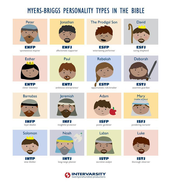 And, just for fun, several friends have posted this on Facebook already, but I thought I’d share. This is, apparently, how it would be if Myers-Briggs personality typing existed in bible times (though there are funny comments on FB, like ‘I thought Paul was more introverted’ etc). I’m a little disappointed that INFJ didn’t get Jesus (I have actually seen so before!), but “insightful protector” is not so bad. I love it that my type is the one weeping – melancholics unite!