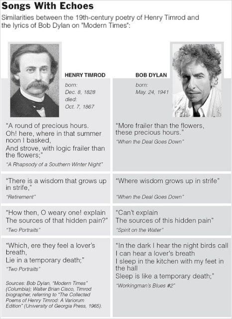 Recently, when I hosted my 'port and poetry' evening, I told those coming that song lyrics counted as poetry. It seems that sometimes song lyrics actually are poetry. Here's a table showing lyrics written by Bob Dylan, compared to lines of poetry composed by Henry Timrod. From The New York Times, via Austin Kleon.