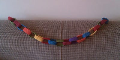 Here’s a little something I made last year, out of scraps from the bunting, and never showed the world. Don’t ask me why I made it or what it's for. I just wanted to have a go at a crochet paper chain. I don’t much like these colours – I am not really into things all rainbowy – but I quite like the idea. This year (I say this every year) I want to make some Christmas decorations. I scored a few rejects from my Mum in the holidays: little wooden, knitted and handmadesy looking things. So next time Christmas comes around I shall have to make sure I actually hang them on something. Last year, as in a couple of weeks ago, about five minutes before my sister and her family arrived for the night, I tried to stick the two little knitted decorations I had somewhere, and thus the pathetic little Christmas spot in the picture below. But I am all inspired to be suitably festive next time!