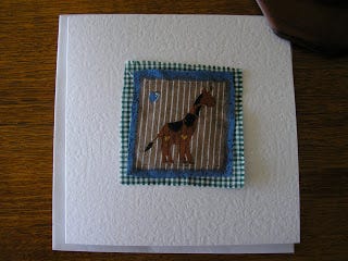 You just buy or find somewhere amongst your stuff some material with small motifs on it that you can cut out individually, team it up with some other kind of material that is plain or has a smallish print/pattern on it (or add in other coloured bits of cupboard) with a bit of "craft glue", and voila!, a card that doesn't take two hours to make — because for some of us there is a fine balance between time and money when it comes down to the value of making things. It's nothing too marvellous but looks OK, yes?