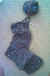 Anyway, what all good craft posts need is a photo, so here's my scarf in progress (with a little piece of my toe and the base of the fan, which made it into the photo). It's just plain old double crochet. I abandoned working any sort of pattern into it, because the wool itself goes from thick to thin consistently (a challenge to my "tension") and varies colour all by itself. If anyone actually wants details on the name of this wool, and the gauge of my hook, well just ask!