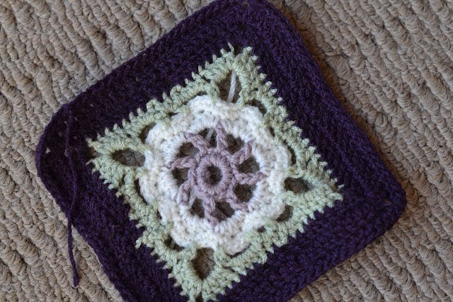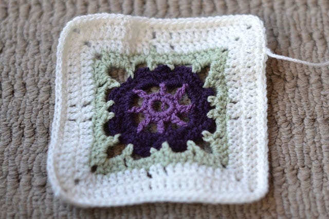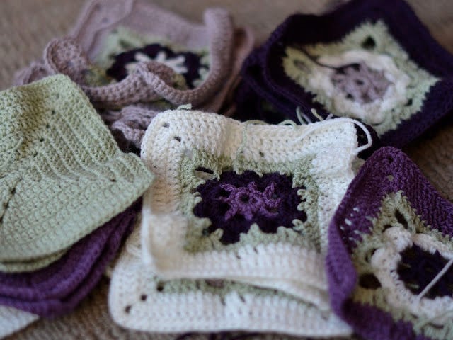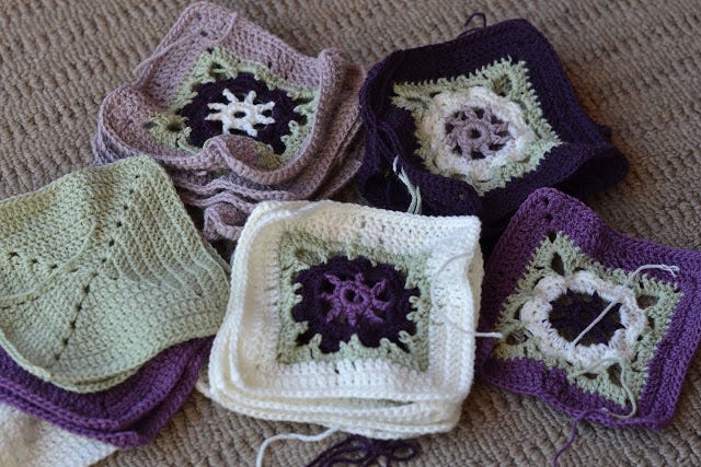 I wasn't going to make the Babette blanket again that I made for her big sister and brother because the joining is so time-consuming, and because I just wanted to make something different, so it took me a while to work out what exactly I would do. I originally planned to use several different motif squares, but in the end settled on only one, which will be interspersed with the plain squares seen on the left. In the end these are rugs for kids to use, so I want it to be reasonably robust.