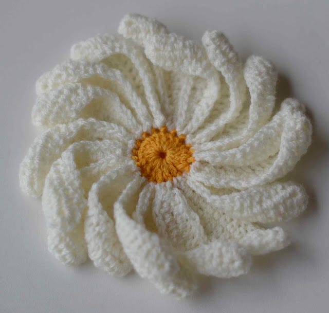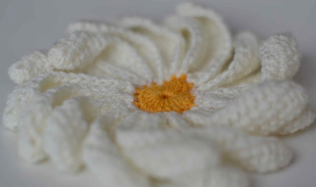 For my next trick, I decided to make a crochet daisy. This is actually a 1950s millinery pattern, but it is meant to be made in fine cotton. I had these wools at home, so just thought I’d give the pattern a go. We are having another Made Fair Market coming up at my church, and I thought perhaps I could make a few flowers for that, but the 18 petals and the time it took to make this one means it is totally unfeasible.