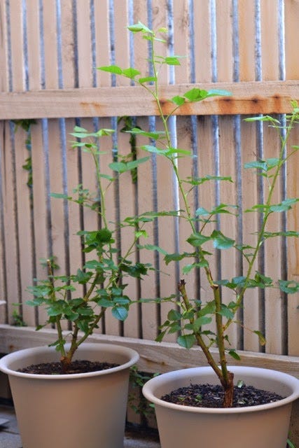 And here're my strange rose bushes. I'm in awe of these bushes. They are literally growing before my eyes. Every time I look out the window I am amazed. (This was them as bare stems on the 6th August.) On each of the bushes one of the stems has gone bezerk, presumably after a little more sunlight.