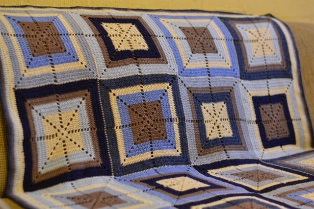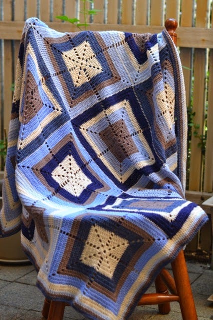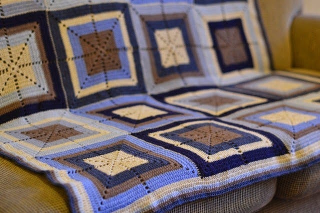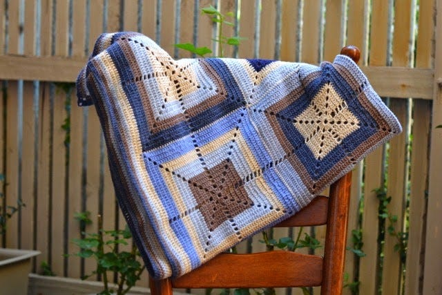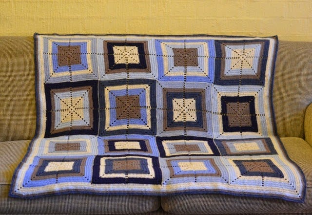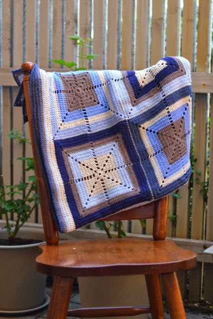 I should acknowledge the inspiration of this person for this rug. I'd decided to make it in blues and browns, in large squares all the same size (no more of those jigsaw-piece rugs!) in a style that was suitable for a boy, and so I googled some such thing, and saw that rug, and thought it was a perfect idea (and was already flipping through Jan Eaton's 200 Crochet Blocks book, which I own and is where this criss cross block pattern comes from). What I thought was interesting was the way the brownish coloured centres and the third colour out in each square were alternated, and I wondered whether that gave a kind of internal harmony to the layout, while keeping the blues random. So I had a go. Perhaps it does.