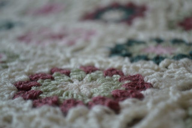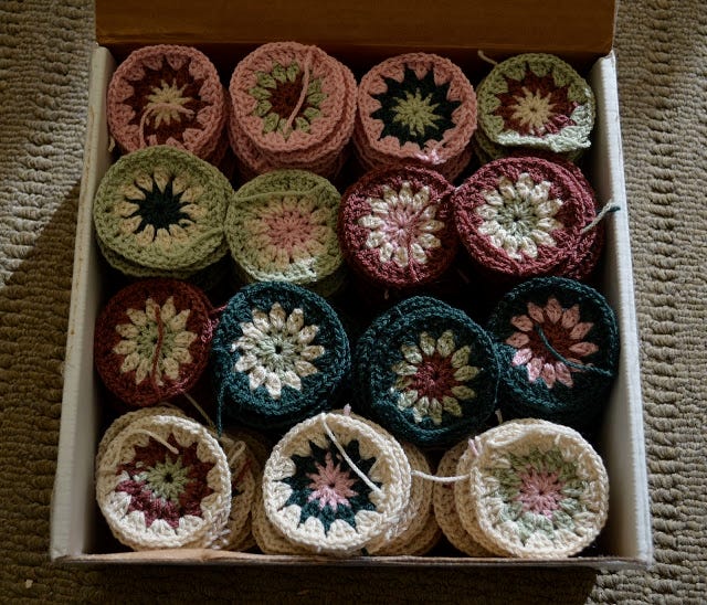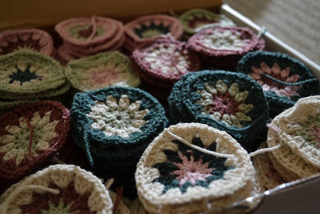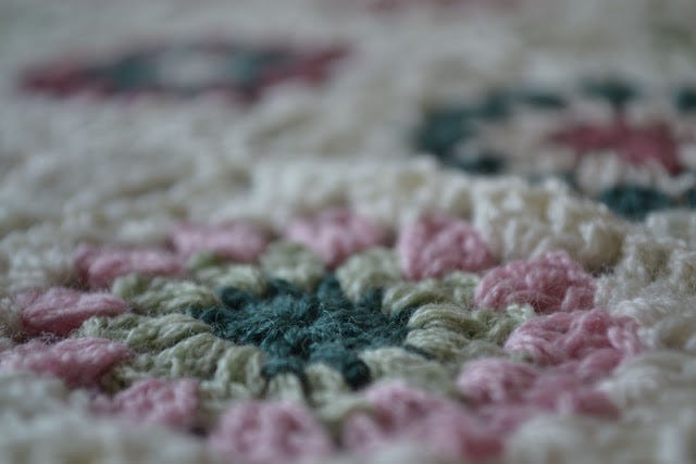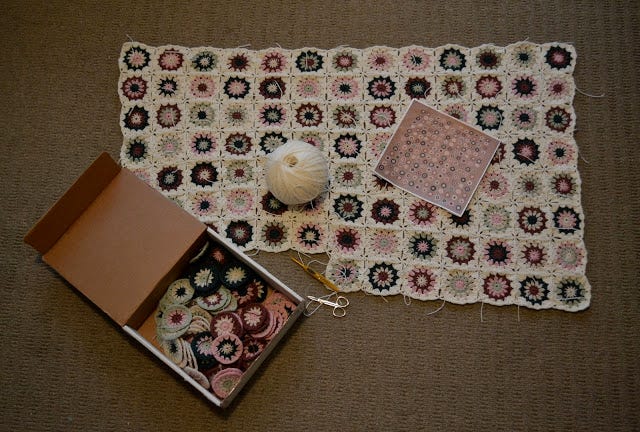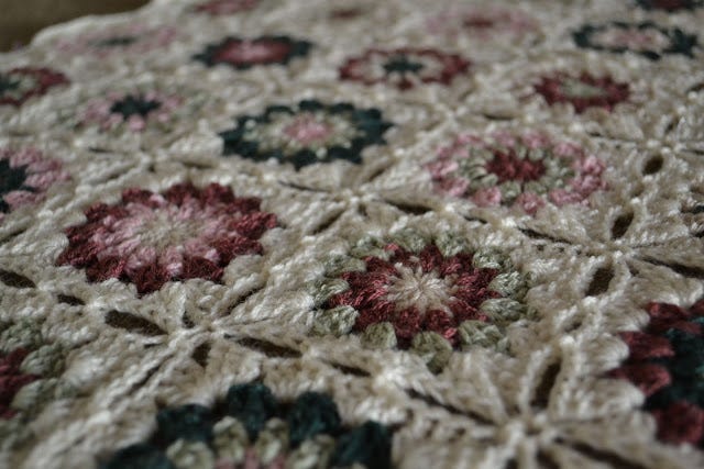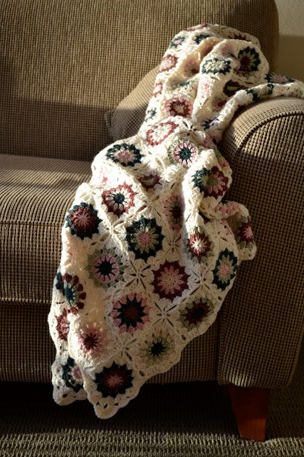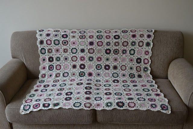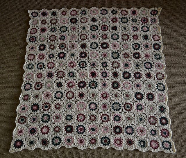 (I didn't actually get a photo of it in my Mum's house in the end, but if you know my Mum, you know that these are her colours, and it matched so nicely in her bedroom. I made the pattern up myself, through some trial and error, after looking at these pictures, and then discovered that there are similar pattern instructions all over the internet.)