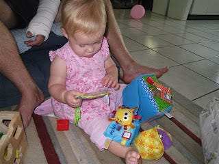 This is Annie with a present I sent up, which is a fabric mail box with letters and packages that she can stuff into it and pull out again (I wanted to give her a wooden Noah's ark, but the practicalities of finding a nice one and then mailing it to Darwin proved undoable):
