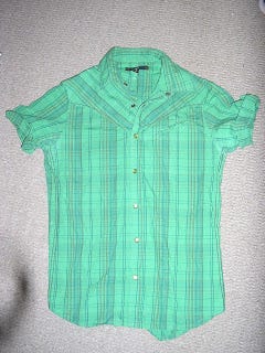I think I need your help people! I went into Vinnies the other day, actually in search of a fancy dress outfit. In there I spotted this shirt, hanging amongst all the other ladies shirts and thought it looked pretty cool, in that sort of checkered-shirts-with-pearl-studs-are-back-in kind of way, so I tried it on and thought it worked and went off to buy it. However, on the way to the cash register I got this sudden sneaking suspicion that it might actually be a men's shirt. So I asked the young, cool-looking bloke who was serving what he thought and he said "it's mens". (It's a size "small", just so you know - and it's roomy.)