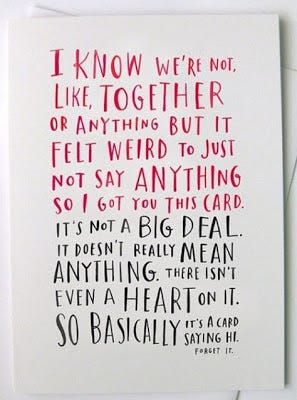 Then there was that one year that I received an electronic card from a guy I’d never met. The story goes that a group of friends of mine were together talking about me, and how poorly I’d been treated by a certain fellow (they’d all apparently observed this, and sometimes it’s nice to know these things aren’t entirely in your own imagination) and this other chap was there and listening, and so decided to send me a Valentine’s card. I never did find out how exactly he got my email address. That was nice. However, an electronic card from a guy you’ve never met, who probably feels sorry for you, is not my ideal Valentine. I don't really count that one.