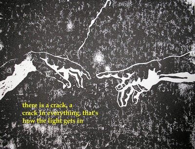 I wanna be Laurel that's why. Lyrics by Leonard Cohen, lino print inspired by Michelangelo and 2 Cor 12:9-10.