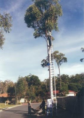 That's my friend Dave from university days up the ladder, and there's a koala up there somewhere. What one has to do to catch a koala is go where koalas go, so that's up the tree, with the help of long ladders and abseiling gear. You then use a long pole with a (very sophisticated) plastic bag on the end (the blue thing visible here) to herd the koala down the tree. This is done by waving it about over it's head. The idea is that you try not to create too much of a stir, even though you've broken into the house with a plastic bag on a pole, and the koala backs calmly right down the tree. But people stand around with catching gear just incase the koala doesn't do it right and jumps.