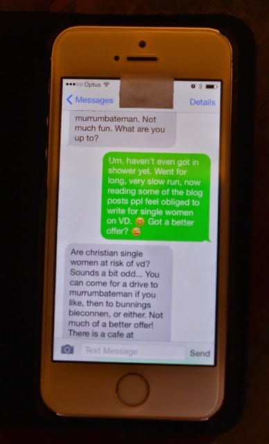 Valentine's Day. I meant Valentine's Day.AliFeb 14, 2015ShareI had this text conversation with a friend this morning (who is married with four kids). I literally cried laughing when I realised what she thought I meant. And then I went to Bunnings after all.PreviousNext