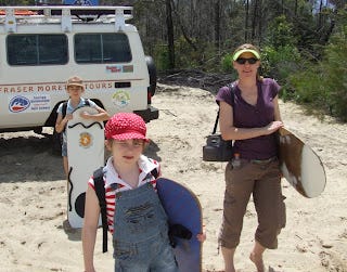 One night we were at my Aunt and Uncle's for dinner, fortuitously, when their Japanese friends called to say they had tickets for themselves and some friends to Moreton Island the next day which they were unable to use and did my Aunt and Uncle know of anyone who could. So, my Mum and I, my sister, husband and two nieces had a day out doing Moreton Island Japanese-tourist style. We didn't know quite what we were in for but found ourselves on a 4WD tour, bumping around the bush and cruising along the beach in the back of a troop carrier, sand tobogganing on what are apparently the world's tallest sand dunes (which was loads of fun and the kids loved it - photo is me and my nieces setting off – if I am going to turn around and reveal all I am at least going to wear my large pterygium-prevention sunglasses :), unlike my poor nieces who can clearly see hardly anything), swimming in a beautiful fresh-water lagoon ... It was a great day out, which took me back to my past – out of that philosophy book and back into nature, reaffirming that "romantic" thing.