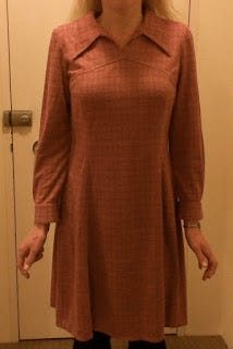 Below is a picture of the dress I put on, under my authentic 70s leather coat. The rest of me looks like a dork in this picture, but I wanted to show you this dress anyway. I mentioned that my Aunt volunteers in an op-shop. Well, she also brings home the rags from the shop, which is anything deemed unsaleable owing either to its style or condition, because she’s like that. Most of them go to her cousin’s farm, but sometimes she salvages items. So we were going through this rag bag and out came this dress. I tried it on and decided I was keeping it. It’s delightfully retro, and I intend to wear it even when I am not in fancy dress. Folks at my church on the lower north shore might think I am queer, but where I live in the inner-west I will be cool.