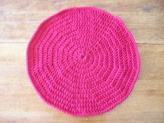 I have been vaguely looking for some placemats for the table for a very long time, and upon realising that I probably wasn't going to find any I liked, I decided to make some. So I just bought wool in the desired colour, from the fabulous Bendigo Woollen Mills, and crocheted a circle. They are not the most exciting placemats you ever saw, and I tried varying the stitch but it was going to get hard to keep the circle lying flat, and varying the colour was going to look silly (maybe in the future there can be more experimenting), so here they are (and it doesn't really curl up around the edge - not sure why that looks so bad on the left in the photo):