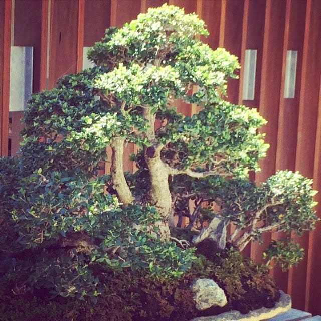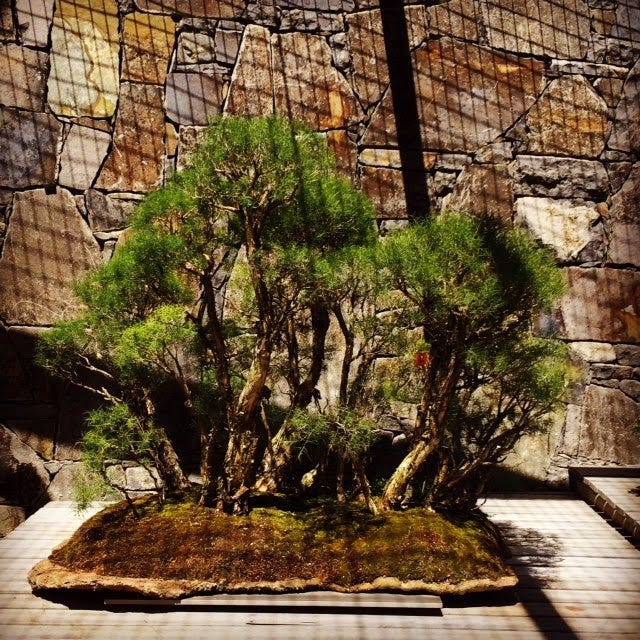 I actually thought I'd re-read Surprised by Joy by CS Lewis, after dabbling in that essay last weekend, as it's been a few years now and I have forgotten things I'd like to remember. So, I finished chapter one, in which Lewis describes his desire for Joy being awakened by his brother's toy moss garden constructed in a biscuit-tin lid, then I went for a wander in the Bonsai Collection. Strangely apt.