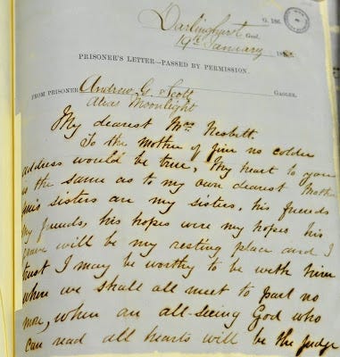 Anyway, I actually thought the content of the letter was rather beautiful. At first I thought it must be a "romantic" letter, but given it's from Andrew, and it's about Jim, probably not, which makes it an even more unusual expression of affection. I think we have lost this art, of so beautifully articulating our affections, of writing such a letter to the mother of someone who presumably has died, even more so than the art of handwriting. I have copied out below what it actually says, which is not what I expected to read from a prisoner called "Moonlight", though it would seem he might have been a preacher before he decided to rob a bank then ride off into the sunset and become a bushranger.