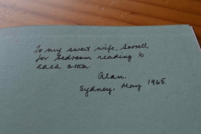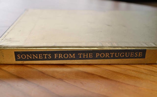 Since I have been posting some of Elizabeth Barrett Browning's sonnets and poems lately, let me share with you a beautiful thing. Yesterday I went to Berkelouw Bookshop for a chai tea and to finish the never-ending novel. Yes, drum roll, I actually finished Romola by George Eliot. I was determined to get there. But as I was leaving the bookshop I just did a quick customary scan of the poetry shelf, and I spied this little gold sleeve lying across the top of the shelves, and thought, oh what is in that mysterious box? So, I turned it around, and the story is told in pictures below. Inside the front cover was scrawled the loveliest thing. I already have a nice copy of this book, but I couldn't leave this one behind. And now I shall wait for the right moment to decide what to do with it.
