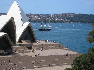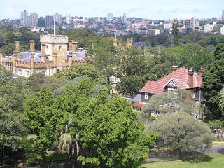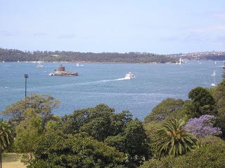 I went in to the city today to have lunch with a friend who lives there. And I mean in the city. This is the view from their place! (That's the young Endeavour going past the Opera House in the top - at least I think it's the young Endeavour - and the bottom is Government House in the Botanic Gardens.)