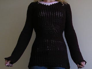 Yesterday I finally finished my unseamly sweater, from the Happy Hooker crochet book. And finally, I am quiet pleased with it. All things considered, this is probably not a difficult pattern to make. The difficulty came in me attempting to alter things to my liking and so continually measuring myself against the pieces that I had and the pattern. Then I made several starts at most sections before I worked out how exactly the stitch was supposed to be done.