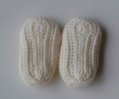 The pattern is from a shop called The Lovely Crow on Etsy. (The shop lady generously says you can make and sell as many as you like too. I don't buy patterns if they say "you are forbidden to sell the finished product" or some such thing. Not that I necessarily want to sell everything. I just appreciate the option.) After the first one I thought these were perhaps unnecessarily complicated little pieces of work, but it was less complicated on the second go and they have a nice sculptured finish to them. See the cute little shaped sole? You are meant to use a slightly thicker yarn too, which would make them more rigid.