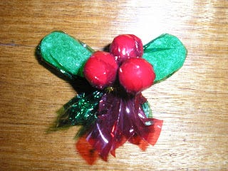Those small coloured blobs you see in the photo are my one Christmas decorating specialty (not quite so classy as the chandelier decorations at the other house - I wonder if I can still scavenge one of those?). They're made with red and green cellophane, jaffas, spearmint leaves and pipe cleaners (if you'd like more instructions than that just ask me). You can scatter them about, hang them over a wine glass, add them to the tree, give them to people etc.