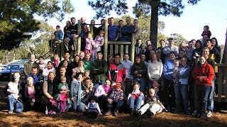 So my article on Military in the Ministry is in this month’s Briefing, but unfortunately James and Sarah, the subjects of the article, didn’t get a photo to us in time to be included (Sarah thought all current ones were a bit daggy and out-of-date and was trying to get a new one). So, for old times’ sake I thought I would post a photo of the Fighting Words Conference in 2005. I am centre left in a bright green jumper. Immediately to my left is James and then Sarah. I have my arm around Jenny Nixon and Andrew (Nixon) is sitting on the ground with their youngest son (in the days before he got all funked up for the first ENGAGE conference ;) …). To my right is the strange legend that is Campo, the jet pilot, then next to him is Aimee and Pinghan. On the ground in front of them with their oldest son (now of four kids) in a striped beanie is Dan and Simone Godde, now also training with Defence Christians in Canberra, and my good friends Nick and Ange Rose are left of them. Michael Hanlon who heads up the whole thing is standing up on the play equipment, with slightly less hair than the others :). They were good days! (Note, this didn't really work, because the picture is so small, but if you go here and click the photo, you can see it in much larger format.)