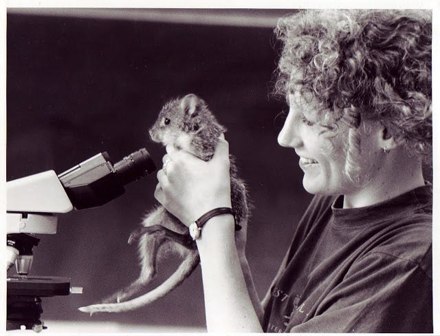 I mentioned my past life in studying wildlife, so here is an old photo I found in a frame under my bed. It was taken for the newspaper in Townsville when I was doing research at James Cook University. What you see pictured is me, in the days of frizzy hair, with Moses the juvenile rufous bettong.