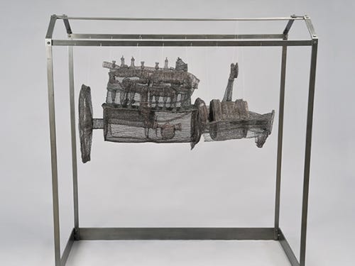 So I thought I'd seen everything on Saturday when I spied a fellow in Newtown with a crocheted cover on his motorbike helmet. Black leathers, black helmet, lacy yellow cover. But now I see that the winner of this year's Lace Works at the Powerhouse Museum, crocheted a car engine - Henry Ford’s first four-cylinder engine housed in the Model N to be exact - out of copper wire.