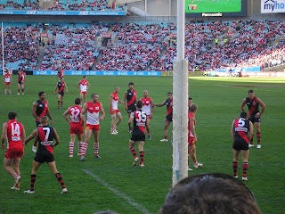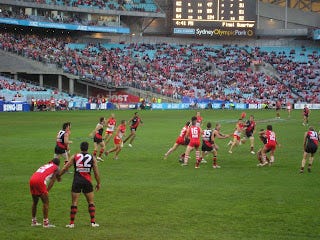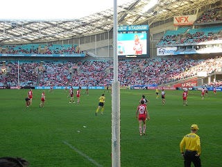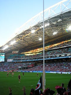 On Sunday afternoon I went to the AFL (football for those not in Australia). That’s about all I can tell you about it, cause that’s about all I know about it! The Sydney Swans played the Essendon Bombers, and the Swans won, by a whopping 143 to 52, which is all that really matters (though I am still undecided about a football team that call themselves the "Swans”). A chap, whose name I believe is Michael O’Lachlan, gave us lots to cheer about, as did the unknown No. 26, who scored a number of goals himself and kicked the ball to a few others (when I am sure he could have done it himself) to score an easy one (I liked the way he did that – nice little bit of sharing – I’m all for caring and sharing with my football). I’ve never been to a live football match in my life, and it was actually a lot of fun! Even when you’re not taking much notice of the football the atmosphere is just lively and exciting. (And what can I say, I think AFL players have nice physiques – they still have necks ...) Of course we ate the obligatory junk like hot chips with tomato sauce and all that which just comes with the event. Here are some photos: