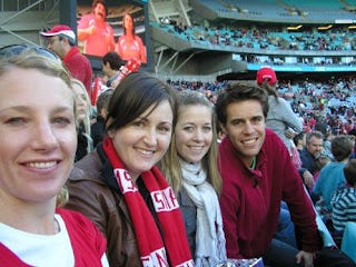 Some of the gang who went. Me (in bad perspective), my friend Trish, who actually coaches Auskick and actually knew the rules - very impressive, Candice and Evan.