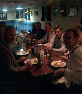 It was a fascinating night for those of us who have never been onboard such a ship before, and a good night for those who have. We had a lovely dinner and dessert in the wardroom, with accompanying tales told by those who’ve been to sea, and tales told by those who haven’t. We then took a tour of the ship, climbing up and down narrow staircases, walking along strange metal corridors, stepping out onto decks, peering into rudimentary sleeping quarters, staring in bewilderment at navigation equipment and seeing all manner of interesting things.