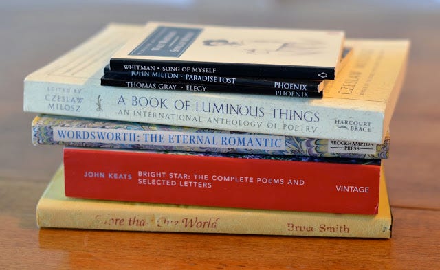 Jean challenged me to write a book-spine poem using only books of poetry. Given that most of my books of poetry are called 'The Complete Poems of ...', 'The Collected Poems of ...' or 'Selected poems of ...' I thought this was going to be a difficult undertaking. But hoorah for those little pocket classics that were everywhere some years ago. So, I have taken a little poetic licence with the old, old story, as also told by Ben (bottom poem), Jean, Erin (second poem down) and Meredith. I've included a somewhat obscure reference to the morning star (see particularly here, and ignore the subtitle) and I was hoping for extra points for including a poem that is also the name of a kind of poem. The title of the last volume, which is fading away, is More than One World.