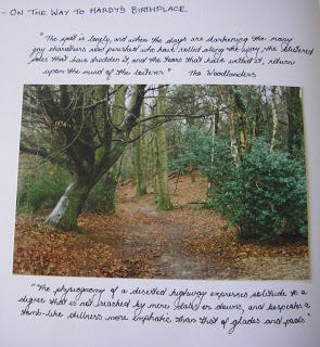 Here is another of Thomas Hardy's poems, with a page out of my old travel album showing Thorncombe wood, which was tramped through on the way to the cottage where Thomas Hardy was born. I had not long finished reading The Woodlanders at the time, thus my accompanying scrawling (if you click the picture you should be able to read it, if you can decipher my handwriting).