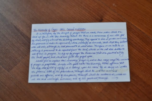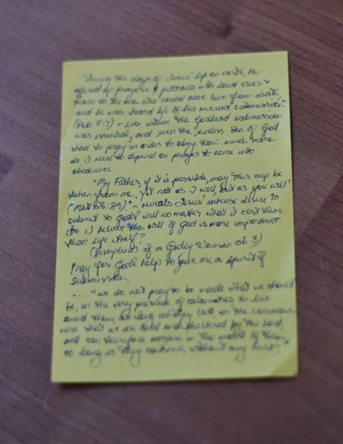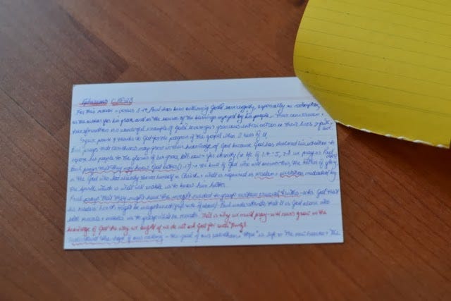 What Miller suggests is card system like the list below (taken from the book), with a bible verse and a few key areas for prayer written on it (not a list of 56 things because you got on a roll one night and thought you’d cover absolutely everything), and on some of them, like suffering people, are just names. So, that was my new aim.
