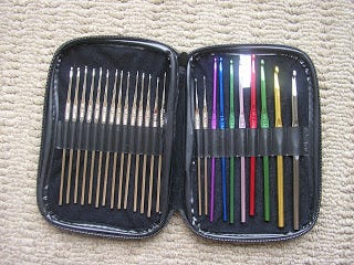 I got this impressive line up of crochet hooks for Christmas. I snapped a 5.5 mm plastic hook, so looked on ebay for metal ones and found this going cheap and ordered it. Then Mum asked me what I'd like for Christmas and I said 'well you can give me this' and handed it over (then got a big surprise on Christmas morning :)). There's more hooks in there than I'll probably ever use, especially down the wincy end, but I like my little zip-up cache of them anyway.