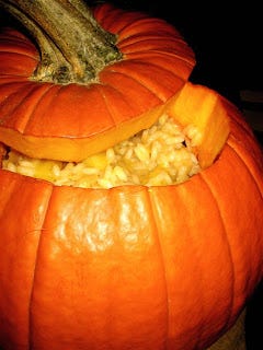 Preheat the oven to 190 degrees Celsius (375 degrees Fahrenheit). Place the rice, stock, butter and pumpkin in an ovenproof dish and cover tightly with a lid or aluminium foil (note, use a large dish, or two smaller ones, as it expands). Bake for 30 minutes or until the rice is soft. (I usually find I give it 5 or so minutes more.)
