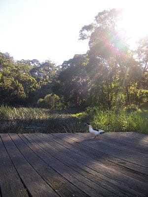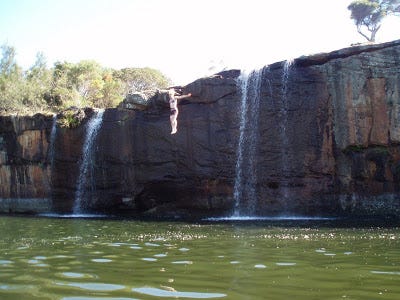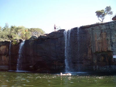 *Having worked for NPWS I know that barriers and “no jumping” signs are there to prevent liability in legal action, not necessarily because they have the power of the law to tell people they can’t jump off rocks. Apparently the rangers come down here and turn a blind eye, and my seasoned friend tells me that in summer it’s like 'Piccadilly Circus' with everyone lined up waiting to jump. I was a little dubious about this, because the tide was very low (this is a lagoon just in behind the ocean) and I thought the water was barely deep enough for jumping from such a height, but I figured I’d live. (While I do like wild adventures, there are ways of doing them responsibly and I’d never jump off anything without doing a reconnaissance of the water below first. As teenagers we were always jumping, or otherwise falling with style (there was rarely any straight boring old "jumping"), into this spot we called "The Bombing Hole" (my claim to fame is being the only girl who ever jumped from the top of "the bombing tower"), but the one rule was that someone had to go in first and make sure no submerged logs etc had washed in since last time.)