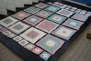 Stayed tuned for the three biggest square sizes (which I will block when the above squares are completely dry, then I have to stitch it all together - aghh!).