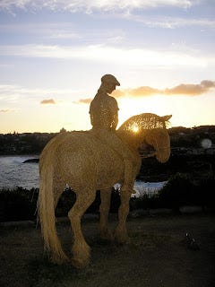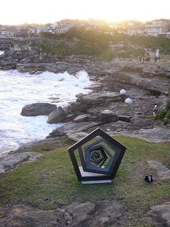 I went along to Sculptures by the Sea last Friday night, with George and a few others. These really are snaps I took as I raced along to meet people, trying not to get strangers in the photo (but it's always a pleasant atmosphere there, even if it can end up like Harpers Bazaar). Afterwards we ate fish and chips on Bondi Beach and then all sampled a little deep-fried Mars Bar - I consider myself lucky to be alive today!