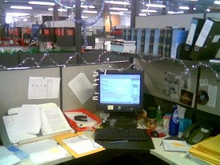 This morning the girls in the team next door at work went to town with Christmas decorations and their work area now looks all very festive. I inherited some left overs, which I thought was a nice, tastefully understated silver piece of something resembling tinsel, so I set to work curling it nicely around the partitions and surrounding my space with it. Ell first told me it looked like I had used barbed wire - quite rude I thought :) - then one of guys walked past and stopped and asked "is it to keep you in or keep other people out?". Oh I laughed. It would seem that my effort to join in the festivities looks rather like I have razor-wired my desk.